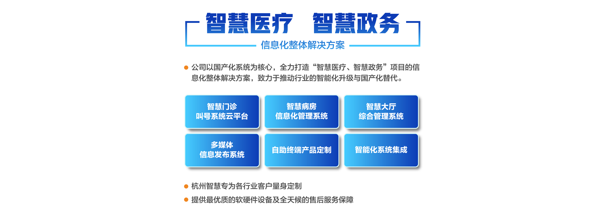 杭州智慧科技有限公司初創(chuàng)于2003年,總部位于重要的電子商務中心中國杭州公司主營業務有:智慧分診叫號系統、智慧病房醫護對講系統、智慧大廳綜合管理系統、智慧政務管理系統、智慧多媒體信息發(fā)布系統、導診系統及各自助終端產品定制。專為各行業客戶量身定制。公司已有20余年行業經驗沉淀積累,擁有優(yōu)秀的產品外觀設計師和各類中高級專業技術工程師,確保所研發(fā)的產品具有行業領先的外觀及可靠的技術性能。并擁有權威部門頒發(fā)的各類知識產權及專利證書,30多項資質證書、800多個合作伙伴、2000多個項目成功案例經驗。 智慧產品已遍及全國各醫療、政務、金融、通訊、公安、工商、稅務等行業,形成以“立足杭州、輻射長三角、拓展全國”的戰(zhàn)略發(fā)展格局,產品經過歷年不斷創(chuàng)新,形成專業化、平臺化,致力于成為智慧產品的領軍企業。 公司建立了完善的技術培訓及售后服務中心,并設24小時熱線咨詢電話解答用戶反饋的問題。同時應客戶要求定期派技術人員到 全國各地進行技術指導輔助用戶正確使用智慧產品并能獨立安裝、調試、日常維護等工作。提供最優(yōu)質的設備及全天候的售后服務保障,智慧永恒不變的服務宗旨——致力于客戶的滿意與成功!...